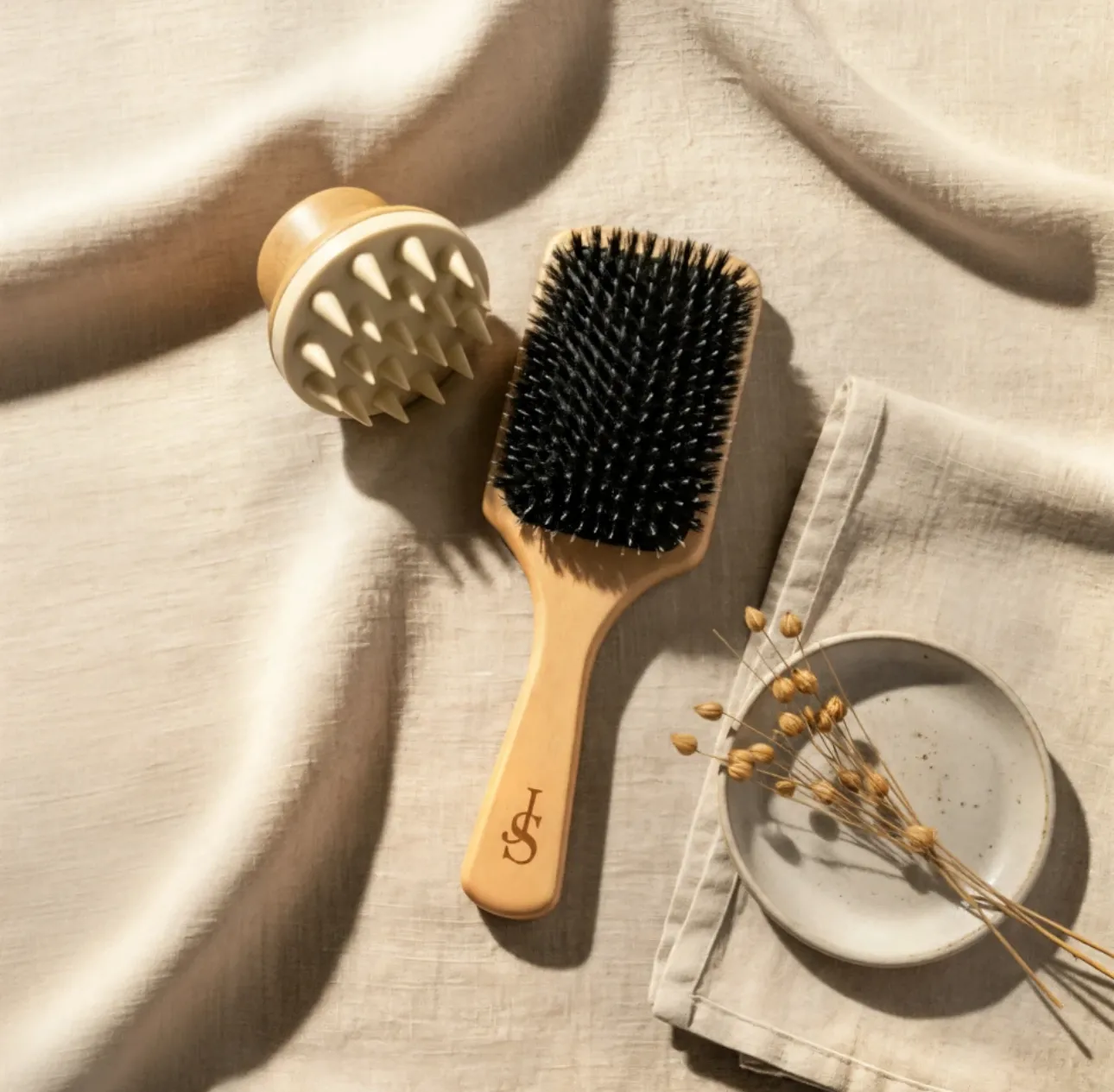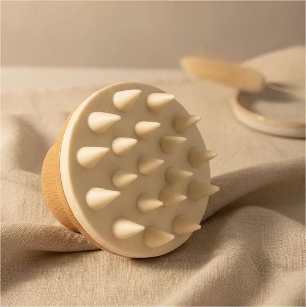 Natūralios buko medienos šepetys švelniam galvos masažui, kraujotakos stimuliavimui ir maloniam plaukų plovimo ritualui.