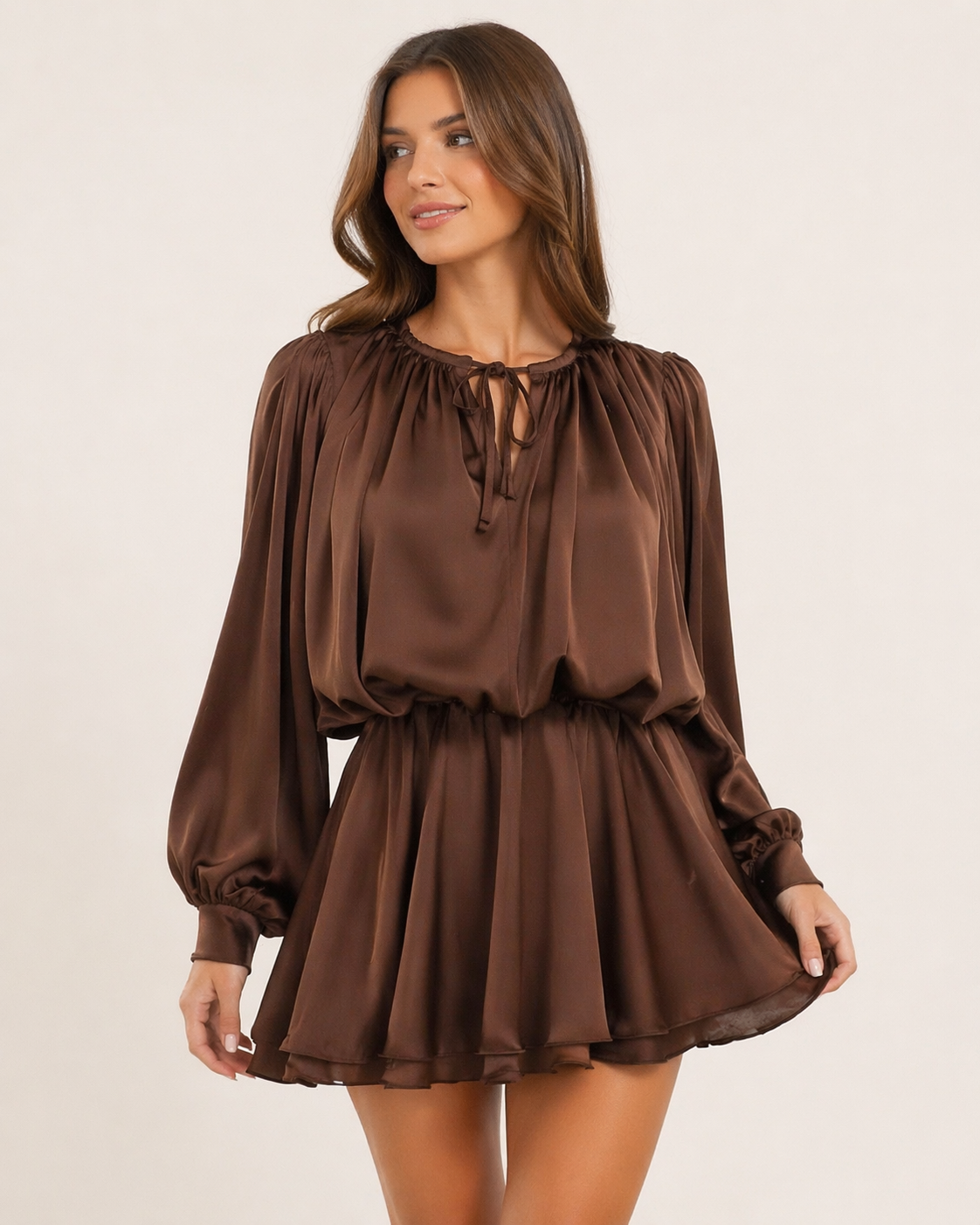 Elegantiška suknelė su pūstomis rankovėmis ir pabrežtu liemeniu.